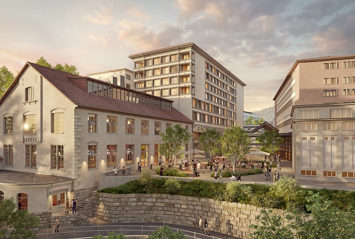 Neuhausen am Rheinfall erhält bis 2029 ein neues Event- und Seminarhotel mit Indoor-Surfanlage. Für das Revier Hotel Rheinfall auf dem Areal der ehemaligen Schweizerischen Industrie Gesellschaft (SIG) liegt nun die Baubewilligung vor. Bauherrin ist die in St. Gallen ansässige Fortimo Group, den Betrieb übernimmt die Revier Hospitality Group mit Sitz in Lenzerheide. Der Baustart ist für 2026 vorgesehen. Das SIG-Gelände entwickelt sich derzeit zu einem Mixed-Use-Quartier. Grundlage des Projekts war ein Architekturwettbewerb von 2019, den das Büro Joos & Mathys gewann. Weil der Rheinfall zum Bundesinventar der Landschaften und Naturdenkmäler von nationaler Bedeutung (BLN) gehört, floss ein bestehender Teil in Planung ein. Der Entwurf  kombiniert einen achtstöckigen Neubau mit einem sanierten Industriegebäude.
