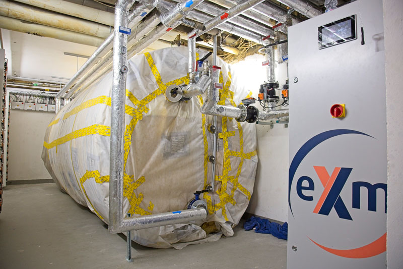 Die Wärme der Module wird über Solarstationen an einen 11.000-Liter-Niedertemperaturspeicher, beides von Varmeco, übertragen. Für einen hohen Ertrag wird die Wärme aus den PVT-Modulen bei niedriger Temperatur ausgekoppelt. Da sie in der Regel nicht für die Warmwasser bereitung oder Hoch-temperaturheizkreise reicht, ist im Hotel eine sogenannte „eXergiemaschine“ (eXm) mit 40 Kilowatt Wärmeleistung als effizienter Nacherhitzer einge baut. Dies ist eine spezielle, von Varmeco und BMS-Energiet echnik entwickelte Wasser-Wasser-Wärmepumpe für Quellent emperaturen bis 55 Grad Celsius. Im Hotel wird die Wärme der Photovoltaik-Thermie-Module auf etwa 65 Grad C elsius angehoben und damit ein System aus drei 1.000-Liter- Speichern geladen. Zugleich kühlt die eXergiemaschine den Rücklauf zu den Photovoltaik-Thermie-Elementen. Das steigert die Wärmeausbeute und die Photovoltaik-Stromerzeugung. Gerhard Lidl erwartet, dass sich die Investition in die neue Energielösung innerhalb von etwa sieben Jahren amortisiert haben wird. „Bisher haben wir für Strom und Erdgas jeweils 7.000 Euro pro Monat ausgegeben. Dank unserer neuen Solaranlage können wir diese Kosten wahrscheinlich auf unter die Hälfte senken.“